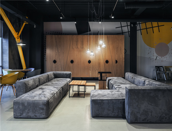 3、工業(yè)風(fēng)暗黑系辦公室設(shè)計(jì):極富張力的空間構(gòu)建、精彩的造型和圖形設(shè)計(jì)、暗黑色調(diào)中的藝術(shù)配色,整個(gè)空間在視覺(jué)的張力中呈現(xiàn)出工業(yè)時(shí)代的厚重感和當(dāng)代理念的時(shí)尚感。建筑內(nèi)部以槽鋼構(gòu)架呈現(xiàn)出原始粗獷的工業(yè)魅力,張弛有度的空間體量以及混凝土和木飾面又帶來(lái)親切的現(xiàn)實(shí)感。直白的空間構(gòu)建,加以色彩的輔助所產(chǎn)生的力量感和輕盈感,使整個(gè)空間充滿著視覺(jué)的張力和優(yōu)雅靈動(dòng)的藝術(shù)氣韻。室內(nèi)以開(kāi)闊的木樓梯引導(dǎo)的中軸線規(guī)劃功能布局。木樓梯不僅緊密連接上下兩個(gè)樓層,也是多元化的活動(dòng)中心,面向?qū)?cè)的咖啡吧臺(tái),形成一處大型社交集會(huì)中心。在這條中軸線上還設(shè)有許多共享會(huì)議室等一眾輔助空間。中軸線兩側(cè)是工作區(qū),既有開(kāi)放的共享工位,也有各種比例的獨(dú)立工作間。在整個(gè)暗調(diào)的氛圍中,設(shè)計(jì)團(tuán)隊(duì)以一抹亮黃驚艷了整個(gè)視覺(jué)!再加以深深淺淺優(yōu)雅晴朗的藍(lán)色,猶如一首輕盈悅動(dòng)的歌曲在空間流動(dòng)。