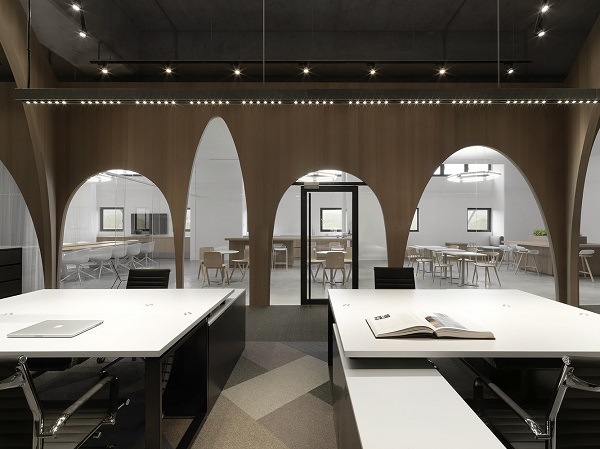 2、考慮到辦公室裝修需要的空間性。設計師結合自身創意,設計了一個個用柱子支撐的空間結構,就像巴黎教堂的穹頂一般。巨大的柱子帶來的大跨度和場地的高屋頂以及隨處可見的鏡面和玻璃隔板,創造出一個兼具創造性和實用性的辦公室空間。整個辦公室設計被稱為“修道院”,包括一個L型的大廳,周圍的拱廊,一面面對建筑的室內并且可以遠望的庭院。通過創造人體尺度的辦公空間小組和放松的其他區域,這項辦公室設計既滿足了辦公所需的私密性,同時又保持了一種中性的工作環境。