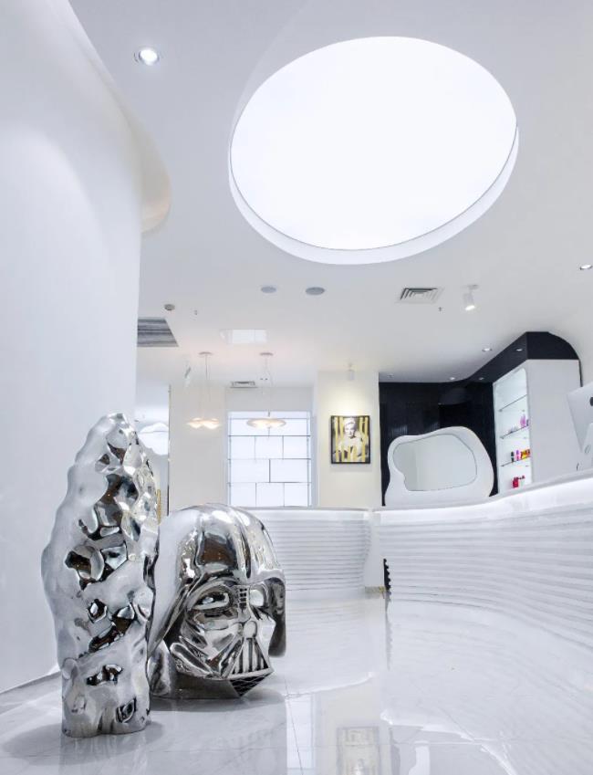 2、設計師用鏡面不銹鋼雕塑,巧妙融于時尚設計,呈現出個性閃耀的藝術特色。金屬鏡面的材質,形成反射,使空間層次更加豐富。前臺背景墻的鯨魚立體浮雕壁飾,簡約和優雅的結合,有著高品質且簡單舒適的生活態度。辦公樓前臺做曲線設計,邊緣的發光燈條,再次勾勒出前臺優美的線條。高檔時尚的美發椅,加厚海綿坐墊,不銹鋼底盤,每一處都與空間融合。天花上不規則的燈,像是發著光的銀河。