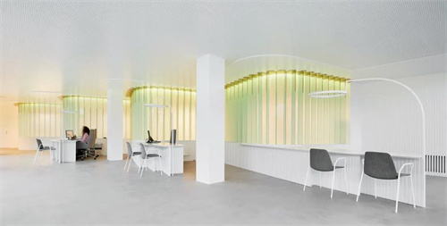 4、電力公司辦公室裝修案例,燈往往是要靠電才能發(fā)光,在這個辦公空間里,設計師采用一座光屏來改變空間動線,成為主要吸引點,借此詮釋了電的其一魅力。辦公室的外圍采用玻璃圍成,給內(nèi)空間景色造成透視感,讓人一眼可以看到室內(nèi)的光屏墻,波浪形光屏的凸面圍合出新的區(qū)域。光屏由垂直排列在隔墻周圍的平滑玻璃板構(gòu)成,這種玻璃可以讓光線疊加,上面是金色的弧形裝飾物,像一片片向日葵的花瓣,在燈光的暈染下,讓人安心享受這里的寧靜與柔和。而這里的辦公桌設置,由光屏的基座展開,和曲面的光屏頂部平行,展現(xiàn)出更強的層次感,來訪者正是通過這樣連續(xù)而開放的,空間逐漸進入到辦公室的內(nèi)部。