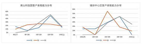 3、核心區域客戶承租能力普遍下滑,以福田中心區、南山科技園*為顯著