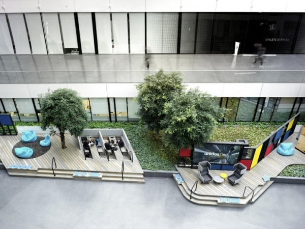 本色打磨的水泥地面、自然原色的木紋地板、大量的綠色植物,并注入契合品牌精神的時尚辦公理念,由此扭轉adidas品牌的傳統單一形象,塑造一個年輕、多元、時尚潮流的新形象。