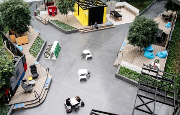 中庭空間通過自然溫馨的材質、完全開敞的布局、以及充滿情感的人文設計,讓這處空間與理性的建筑構造呈現出強烈的視覺反差,加入了時尚潮流的辦公設計元素讓這里華麗蛻變。