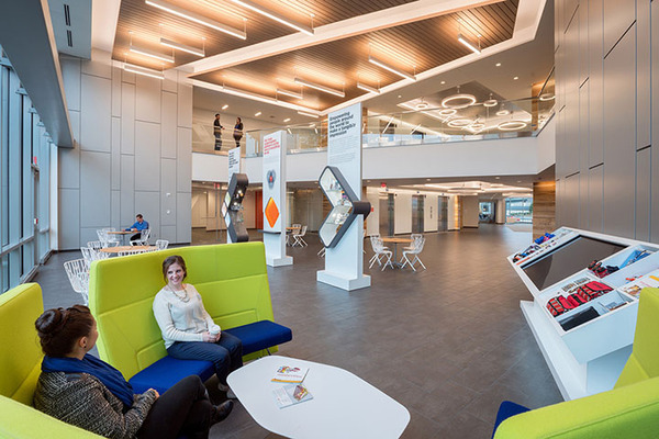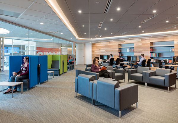 除了協(xié)作空間,設(shè)計(jì)團(tuán)隊(duì)還設(shè)計(jì)了一處閱覽空間,給團(tuán)隊(duì)成員提供一處寧靜的工作區(qū)。為了解決開放式空間所帶來的聲學(xué)問題,設(shè)計(jì)采取多種措施確保聲音的隱私性,以及視聽會(huì)議室和人多的房間的隔音性能。