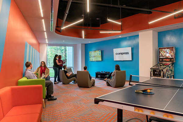 其辦公室裝修設(shè)計(jì)呈現(xiàn)出熱情洋溢、時(shí)尚活力的空間氛圍。躍動(dòng)的色彩激發(fā)著人們的創(chuàng)意靈感;靈動(dòng)的布局鼓勵(lì)員工的深度合作與交流;精彩的設(shè)計(jì)映射出Cimpress與時(shí)俱進(jìn)、不斷發(fā)展前進(jìn)的文化理念。