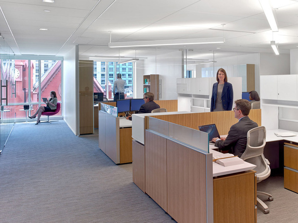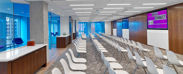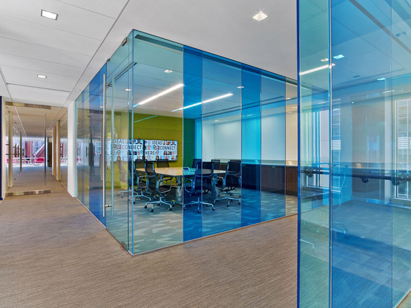 前臺右側的超大會議室被充滿通透感的半透明藍色玻璃板所環繞,打造出一片靈動的空間。傳統的大角落辦公室也被開放式合作區域所取代。辦公室裝修設計保證了室內采光充足且視野良好,保證90%以上的員工可以欣賞到室外風景。