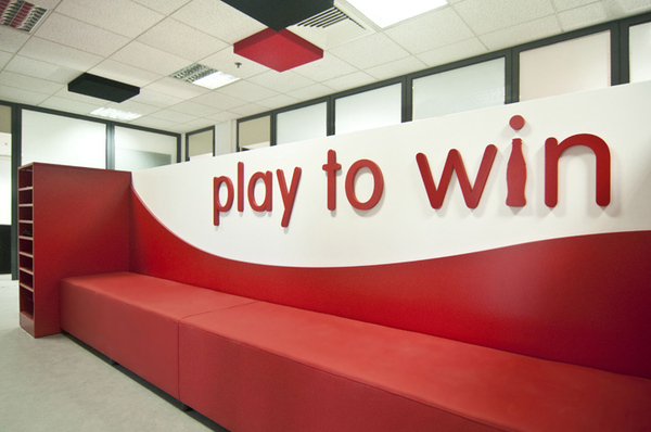 紅色代表著激情與夢想,傳遞出一種積極向上的工作與生活態度。辦公區域則引入了大量的規則幾何體設計,給人一種彩色拼裝積木的視覺感受,質感中不失童真與樂趣。而“Excel、Amaze、Play to Win”等大幅設計字體的運用,不僅起到了很好的裝點空間效果,也是不同工作區間的醒目劃分。