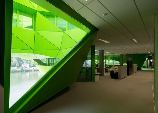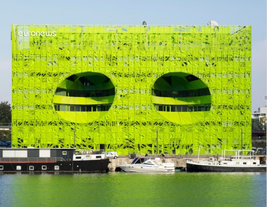 近來,法國里昂海港區(qū)出現(xiàn)了一幢披著綠色外衣的大廈,它就是歐洲主流媒體之一的EuroNews新總部大樓。輕型的釉質幕墻,覆有不規(guī)則的多孔鋁制包層。來源于河水顏色的靈感,讓綠色滲透到了辦公室的“骨血”中。