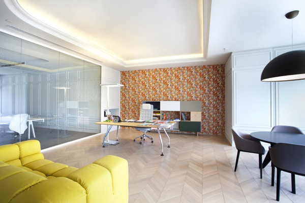 洽談室的設(shè)計,設(shè)計師采用了白色、灰色、黃色、黑色顏色之間的轉(zhuǎn)換,來體現(xiàn)洽談室的價值,人體對顏色很敏感,多種顏色經(jīng)過設(shè)計師的重新搭配,更顯得時尚、創(chuàng)新。