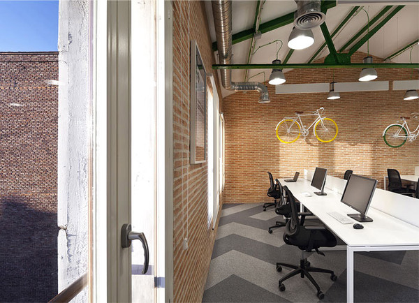 設計師在辦公區域的設計上,采用了壁掛式的自行車作為點綴,自行車的一種人力機械之一,它是由許多簡單機械組成的復雜機械。