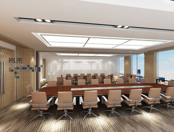 會議室的設計,設計師一邊利用窗簾來調節視覺效果,同時在另外兩側安排條形桌,來擴充不同的人員參會,設計上也是由淺及深,整個空間顯得比較沉穩,嚴肅而靜謐。
