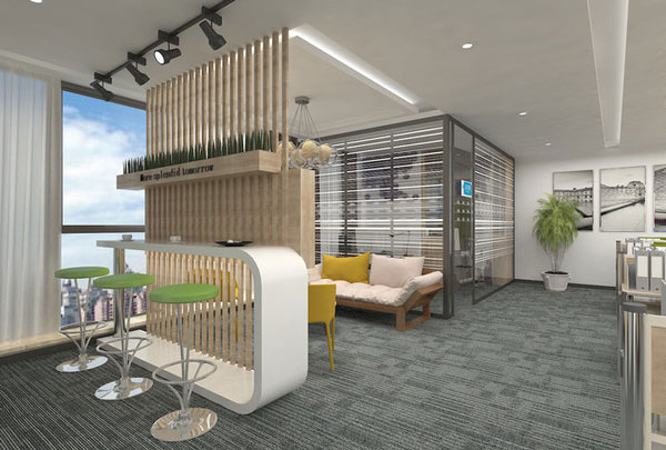茶水間與休息區域的設計,設計師在設計的時候,利用簡潔的隔斷分離手法,將空間一份為二,即節約成本、又節約空間,同時符合企業的需求。