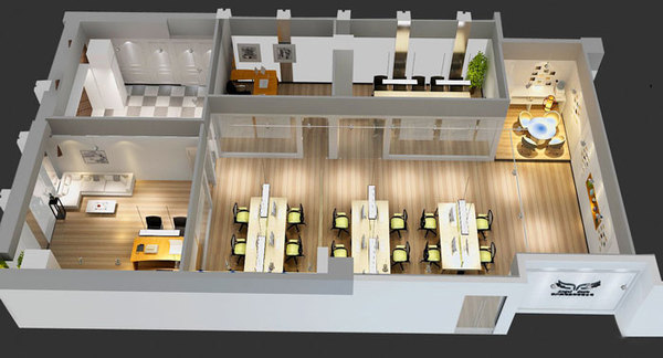 俯視圖:通過以上的俯視圖大家對于空間會有一個直觀的認識,企業品牌設計在外部墻面,經過進門區域進入辦公室,首先經過的就是形象墻,到達打印茶水區域,通過動線拐彎經過開放式辦公區域與會議室、副經理辦公室,**到達總經理辦公室與拍攝區域。