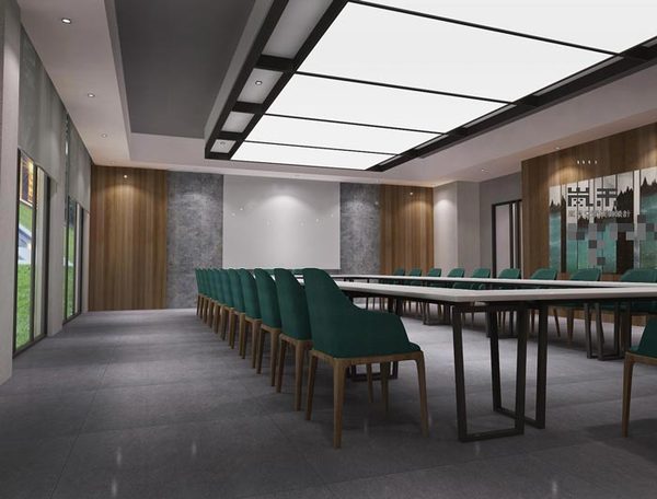 此處會議室設計有所不同,因為其地址在負一層,設計師除了要保證本身的功能與格局外,還需要特別注意燈光的布置,設計師的目標就是布置的簡單大氣且帶有商業氣息。