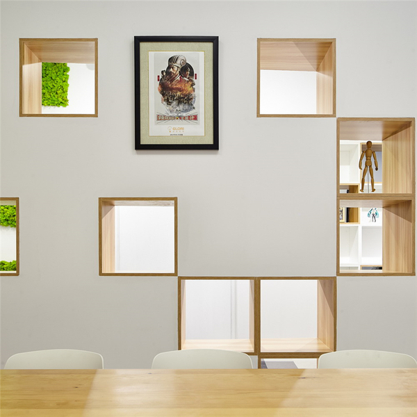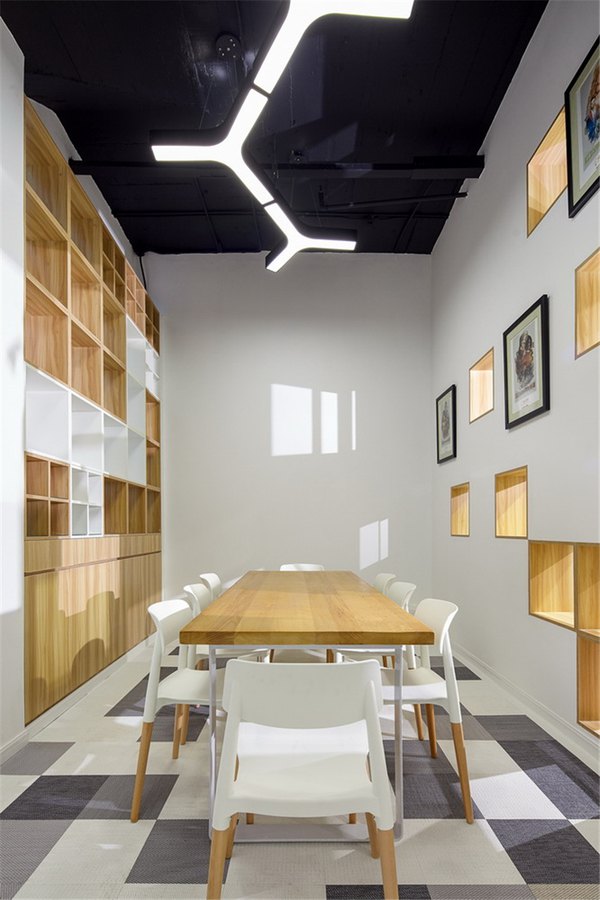 作為舊辦公室翻新設計,設計師首先通過調整辦公室格局、整合自然光與人工光源,一掃之前的沉悶和陰暗,有效提升了空間的舒適度。周圍的小型辦公室后移,與放大后的中央辦公區域進行光源共享,同時將白色作為底色,引入南側窗外的自然光,加之屋頂的Y型吊燈、射燈等立體的人造光,大面積的辦公空間被瞬間點亮,整個辦公室明朗通透,舒適宜人。