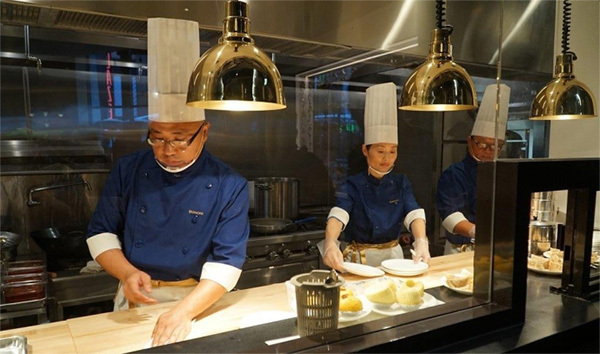 既然餐廳取名“東坡酒樓”,那么就要符合這個意境的餐廳環(huán)境設計。設計師CallisonRTKL想象著東坡居士的工作室該有的樣子,以筆,墨,紙和硯四個元素設計的大堂與品牌的**藍色和香檳交織在一起。