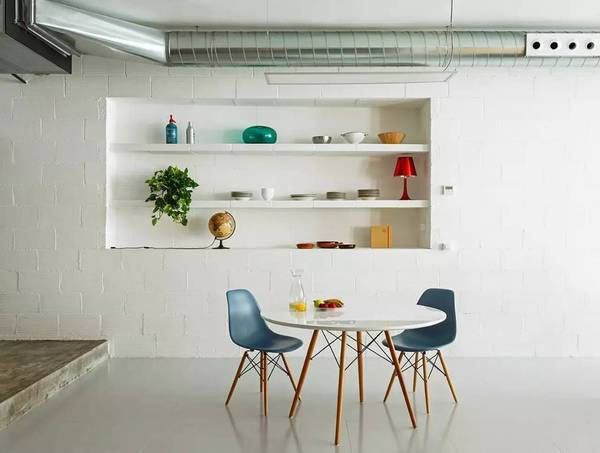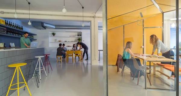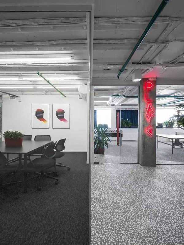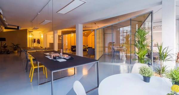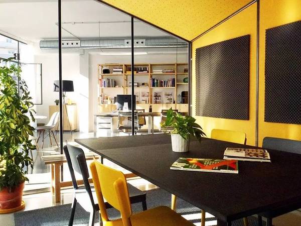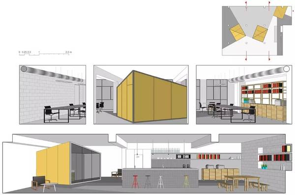 此空間是一個由鋼筋混泥土柱子和懸梁支撐的300平米大開敞空間。結構由三個中心線組成,清楚地配備了所需的功能計劃:兩個辦公室位于相對的兩側,公共會議室和休息區在中心。