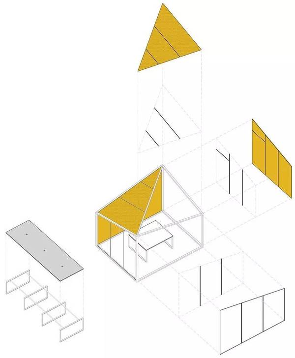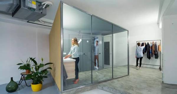 正交排布的網狀結構體系和模塊化的立面相結合使中間的區域比兩邊要窄,為布置兩個相似的辦公室制造了難度。建筑師決定在空間中插入三個塊狀空間,其中兩個用于會議,另一個用作衛生間。其獨立于原有空間存在,使空間更有層次和秩序感。