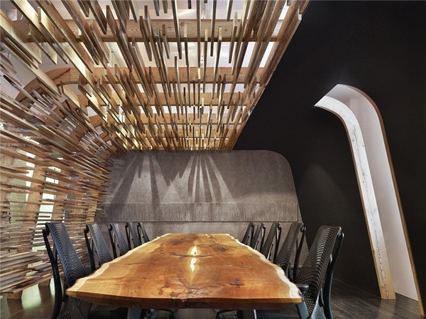 會(huì)議室的墻面由毛氈與黑板以及落葉松木條板組成,無(wú)序的條板構(gòu)造像是牛身體內(nèi)的經(jīng)脈??臻g結(jié)構(gòu)如同一艘小船或原始人居住的棚屋。