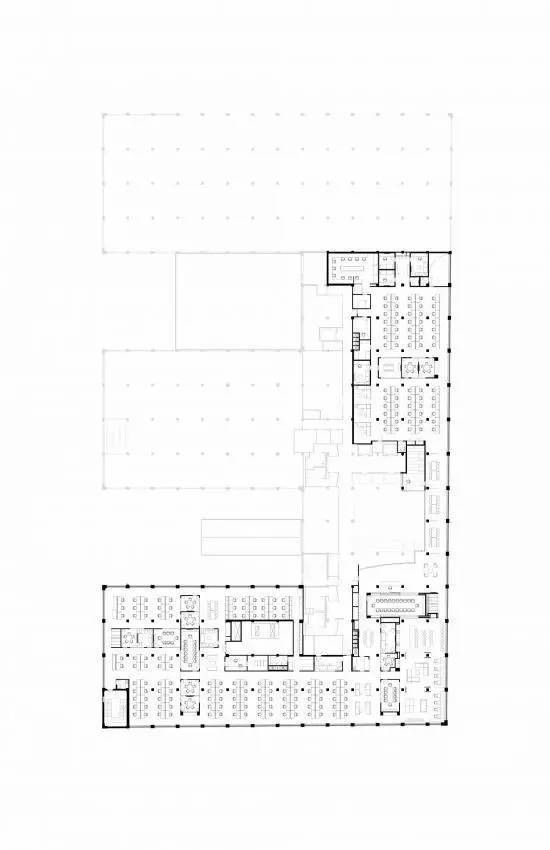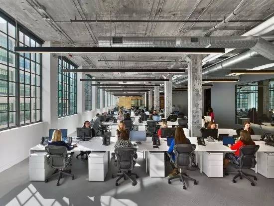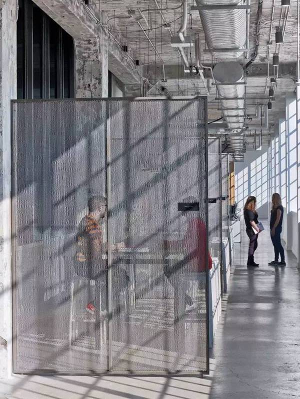 結構柱和梁暴露在外,依然覆蓋著近乎一個世紀的涂料,*小程度的噴砂以防止剝落。表面和家具的靈感來自原始空間;自由形式盒子被包裹在膠合板和深灰色的板巖,椅子顏色從混凝土墻上采樣。設計師設計了一個穿孔金屬網系統,以允許整個辦公室的開放性和流動性。