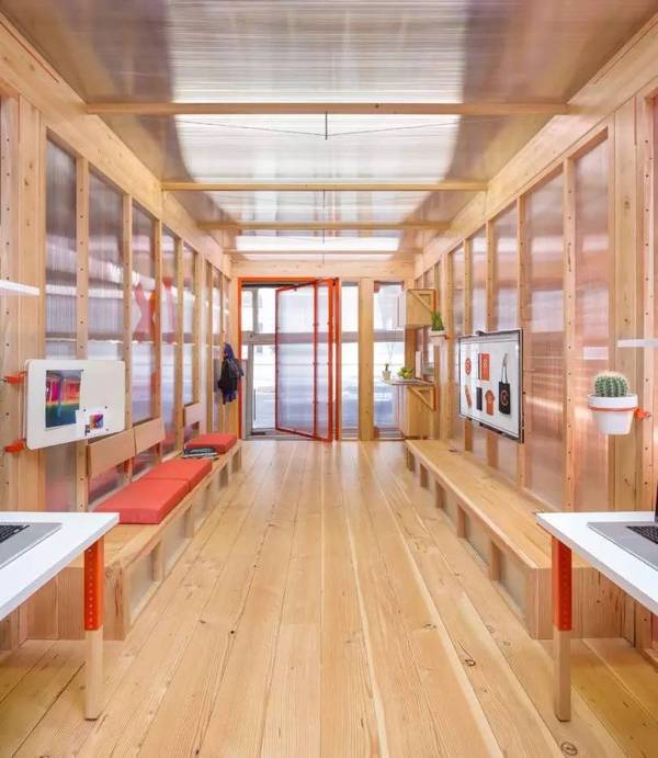 設(shè)計(jì)師保留了拖車的后梁結(jié)構(gòu),使用聚碳酸酯面板作為整個(gè)辦公室的墻壁。這種材質(zhì)的面板允許大量光線填充空間,同時(shí)也能吸收一些自然光,使得室內(nèi)光線不那么刺眼。設(shè)計(jì)師用從本地采購的道格拉斯冷杉木來與半透明的墻壁搭配。 此外,他們還大膽的采用紅色以及其它鮮艷的顏色來活躍氣氛。