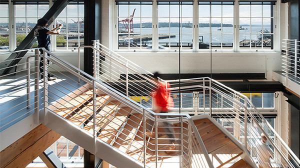 設計師用新的鋼結構與再生木制成樓梯,連接上下樓,開放式的辦公室設計在這一基礎上再次放大,這種辦公室是非常利于交流的,比起封閉的辦公室,我們更能感受到團隊氣氛。
