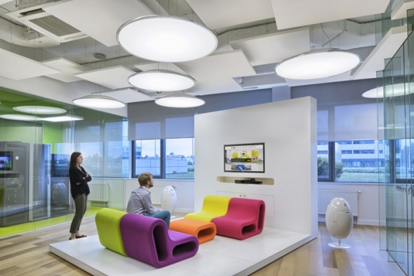 多彩的協(xié)作空間,圓形的頂與圓形的燈上下交錯構筑了一個動感有趣的視覺空間,并與地面圓形的地毯形成形式上的呼應;而墻面局部點綴的色彩也與彩色地毯相映成趣。流暢的圓弧造型和曲面高靠背椅帶來柔和優(yōu)雅的工作氛圍。