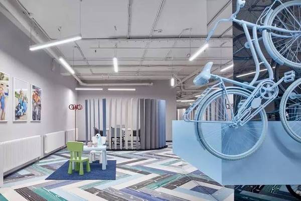 這種梯級的色彩配比猶如美麗的風景畫一般令人賞心悅目,也再次點明本案的設計主題:運動、青春、以及浪漫主義的藝術情懷。接待臺旁邊那一組粉藍色自行車藝術裝置再次強化了這個設計主題。接待區的多元混搭組合設計,也在向大家傳遞這是一個多功能綜合型的辦公室屬性。