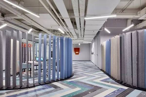 銷售工作區分別以毛氈制作的可旋轉角度的隔屏界定出一個個工作空間。這些毛氈隔屏既有吸音的作用,同時每片又可調節旋轉角度,形成或私密或開放的視覺效果。每組隔屏都可以隨意移動,空間可隨著團隊的工作需求而自由組合與變化。這樣的創意設計為公司的發展、團隊的變化帶來更多的自由可變性。由白、藍、灰、淺色系組成的毛氈色彩與地面主色調形成呼應。