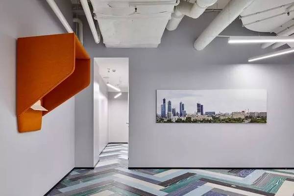 辦公場地的前身是一個停車場,頂面有著眾多龐雜的管道系統。設計師的解決方法是首先把整個室內空間全部噴成白色,包括所有的孔隙、格子以及頂面眾多的機電管道。清一色的白色噴涂令原本雜亂無章的空間成為一個干凈明亮的視覺整體。隨后,設計師為這個純凈的空間注入他們在本案所要表達的創意主體和色調:漂亮的地面設計。采用仿木地板的瓷磚,分別制作成藍色、灰色、綠色、白色、黑色,幾組色彩以人字紋交錯排列,在偌大的空間里形成**動感和視覺魅力的空間效果。