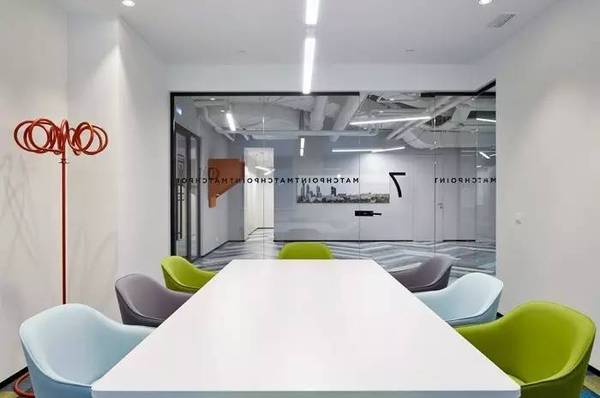 沿墻布局的會議室、辦公室等獨立空間與開放區域僅由通透的玻璃做隔墻,以保證空間在視覺效果上的連貫和完整性。并且這些獨立空間的頂和墻不做任何其它修飾,只在地面的地毯拼貼上延續整體的色彩搭配。