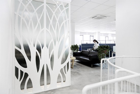 辦公室裝修的屏風(fēng)設(shè)計(jì)不僅僅是處于玄關(guān)的作用而設(shè)置,也有著很大的裝飾作用。鏤空的樹(shù)形結(jié)構(gòu)造型設(shè)計(jì),一層模糊的鋼化玻璃,隔絕視線(xiàn)的同時(shí),也營(yíng)造了一個(gè)朦朧而富有趣味性的室內(nèi)空間。
