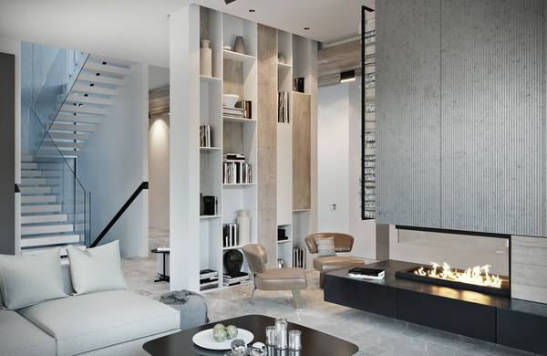 這個現代化的室內是為離莫斯科不遠的私人住宅而建的。使用簡單廉價的材料和一些昂貴的家具,但取得了良好的效果。
