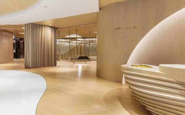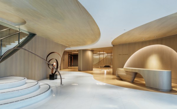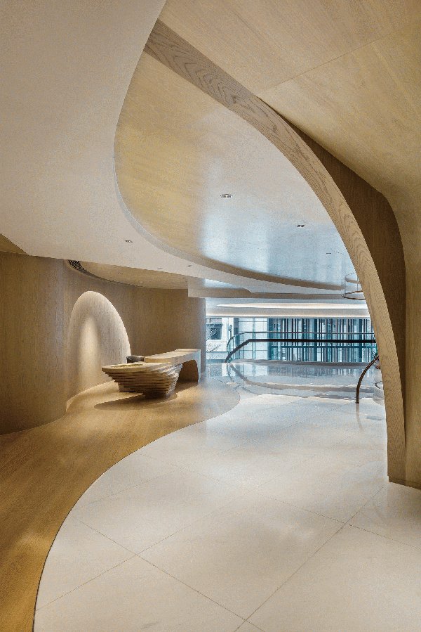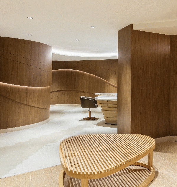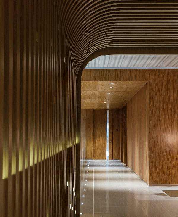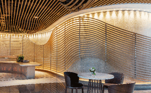 會所內(nèi)的木材不僅僅是結(jié)構(gòu)性的支持,起伏有致的輪廓劃分出不同區(qū)域,優(yōu)雅的弧線跨越寬敞的空間與柔和的燈光產(chǎn)生巧妙的相互作用。豐富的線條增強空間的立體感而不失悠閑的舒適享受,精妙的雕塑元素糅合簡約的燈光折射及滲光燈槽,整體干凈利落,構(gòu)筑出精美雅意而富藝術感的視覺效果,凸顯設計師細膩的設計考量。