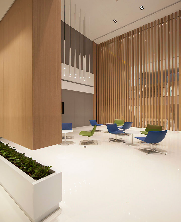 從地面延伸到天花的木色及縱向木色格柵,為員工營造溫馨舒適的緩沖空間并可作為開放討論區(qū)使用。