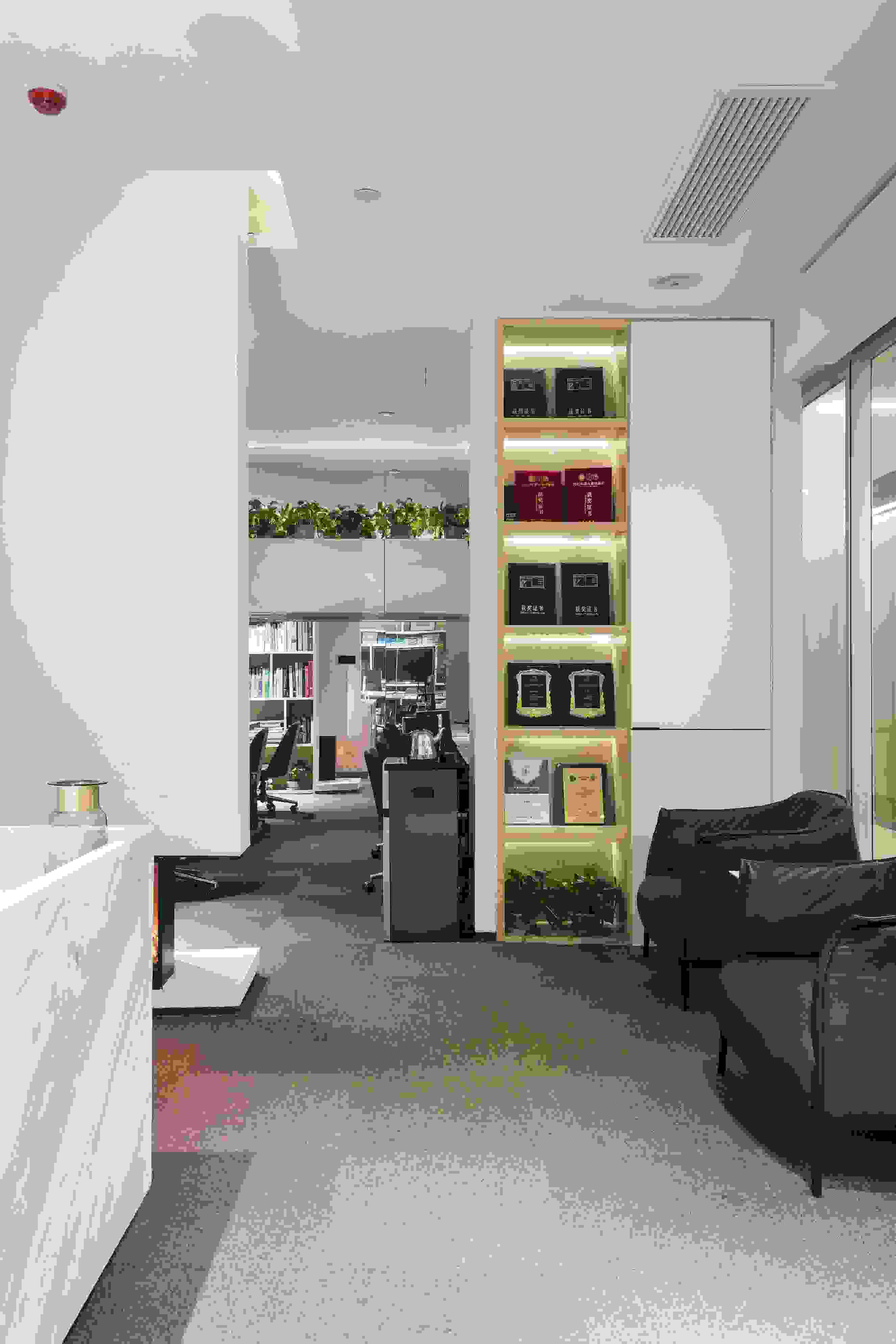 室內(nèi)過度空間(如閱讀區(qū))提供了人與人之外的交流,室內(nèi)空間采用單純的材質(zhì)和線條,配以鏡面和綠植,營造清晰、舒適的辦公環(huán)境。