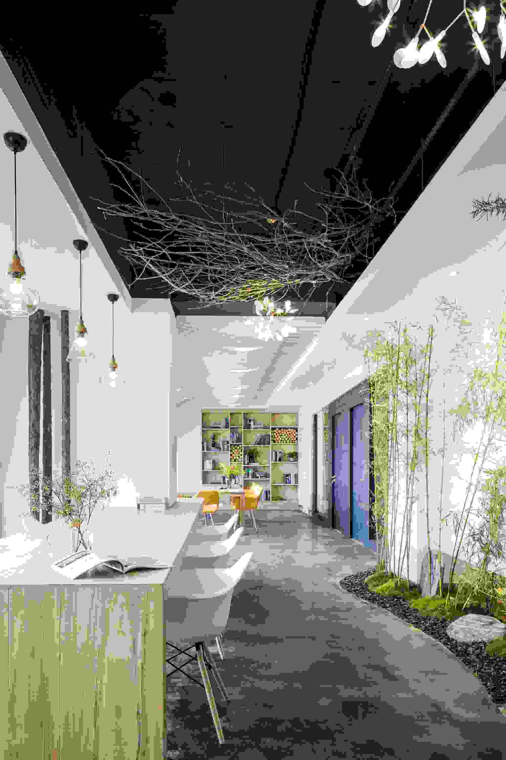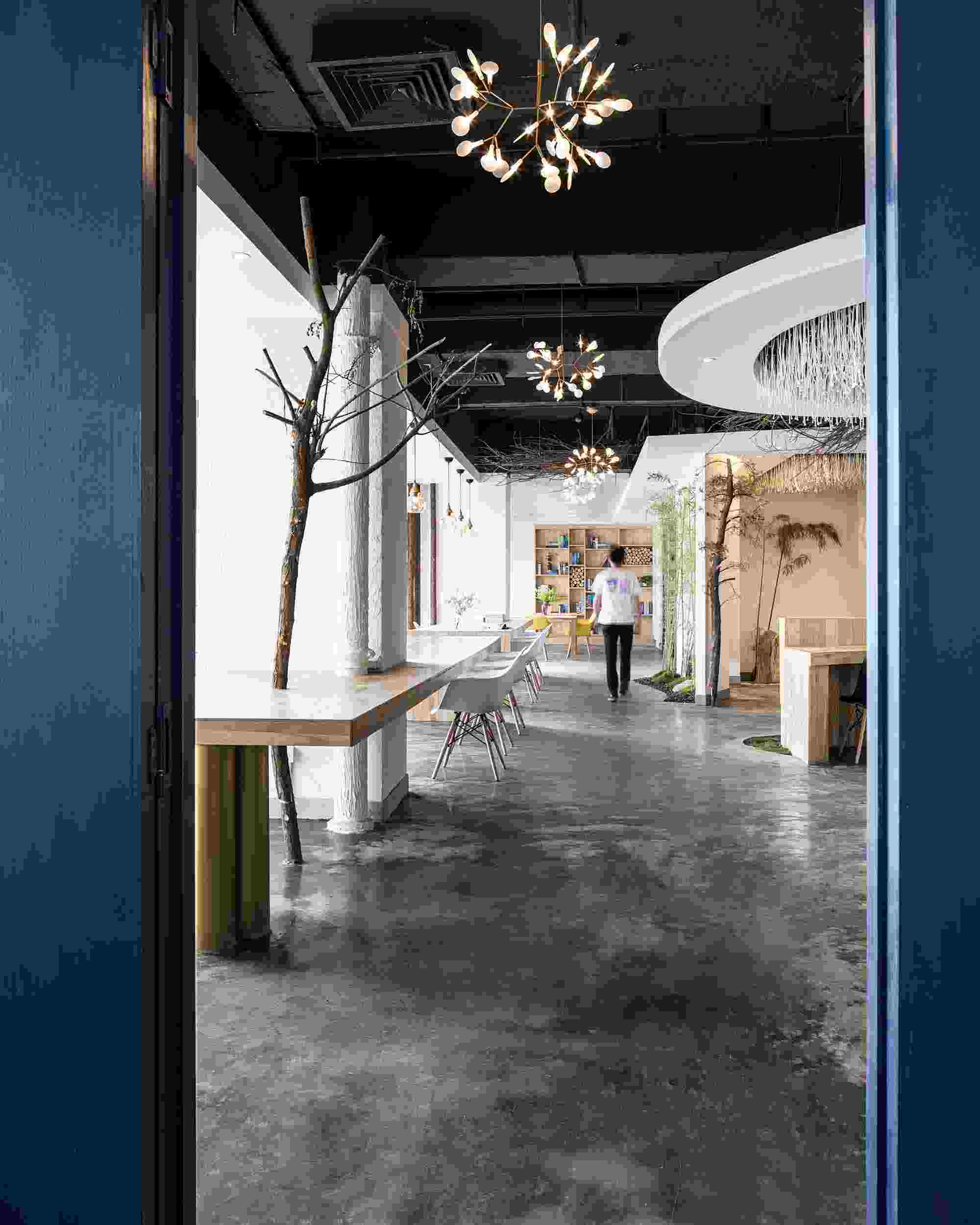 東方的美學向來是含蓄溫婉的,LOGO墻處的玻璃透景配合自然的竹石,隨著太陽的變化,光影也在不斷的變化,猶如人生。在材料的運用上選用的都是一些環保低碳的天然材料,如樹枝、石竹、枯木、天然原木板,地面則是采用了水泥自流平的方式。