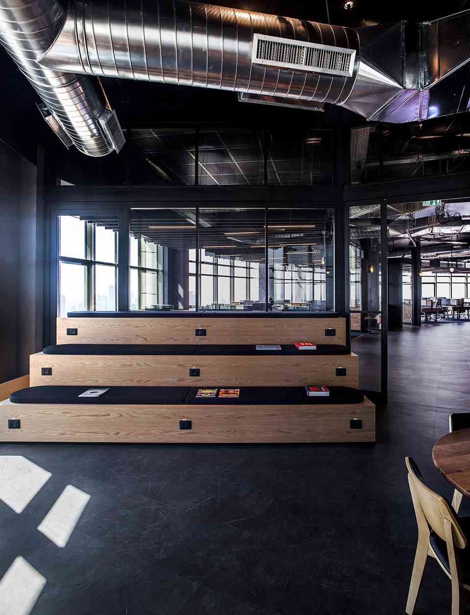 粗糙的原木、不加修飾的混凝土核心筒墻體以及銹色的金屬結(jié)構(gòu)凸顯了這個(gè)辦公空間的工業(yè)氣息。“巧妙地設(shè)計(jì)讓位于城市中心的辦公空間能夠與公司所有數(shù)據(jù)的來源 – 船只發(fā)生了聯(lián)系。我們有意避免了讓人能夠聯(lián)想起豪華游艇的任何元素,而是渲染出一種如同工業(yè)港口般的粗糙氛圍。”事務(wù)所創(chuàng)始人Roy David解釋道。