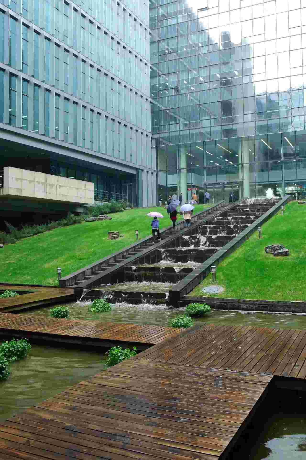 這五棟樓包圍著一個有山有水的花園。負一樓是休閑餐飲區,有不同菜系的中餐廳、西餐廳、面包坊、發型屋、按摩屋等等。樓內還有健身房、室內攀巖館等。工作累了的員工可以隨時來休息,換換腦子。