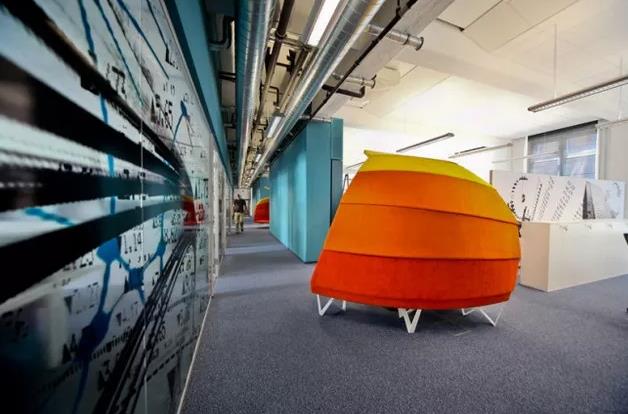 4、國外某報紙出版社辦公室裝修設計要求現代,新潮。開放式的空間和透明的玻璃使室內都變得通透起來,幾何或數字的涂鴉,充滿個性又兼具激勵員工,藍色和橙色的漸變十分的搶眼!