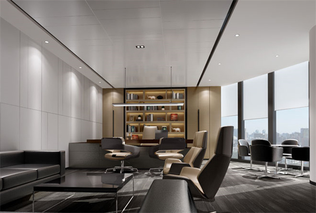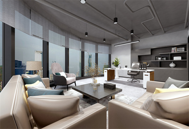3、集團(tuán)總裁、總經(jīng)理等領(lǐng)導(dǎo)辦公室裝修設(shè)計(jì)直接代表著企業(yè)的形象和實(shí)力。案例中展示的總裁辦公室為新中式風(fēng)格,總裁辦公室既有辦公區(qū)也有接待區(qū),方便了總裁接待客戶。新中式風(fēng)格既凸顯了總裁的儒雅,也體現(xiàn)了企業(yè)務(wù)實(shí)、內(nèi)斂的特性。